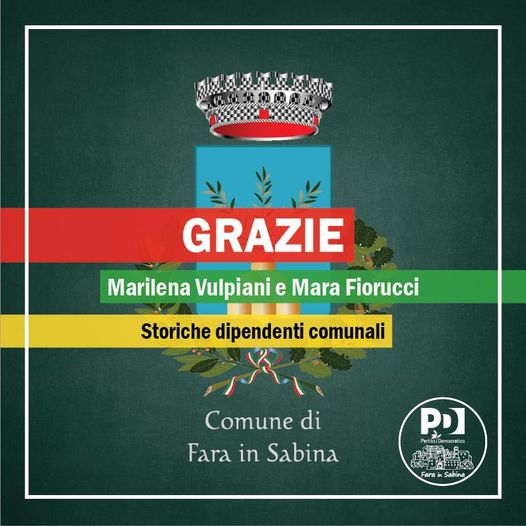 Un grazie a Mara Fiorucci e Marilena Vulpiani per il lavoro svolto in questi anni per il comune di Fara in Sabina da tutto il Circolo Pd di Fara in Sabina. Di seguito le parole degli amministratori del Pd che negli anni hanno avuto il piacere di collaborare con loro “Siamo grati a Marilena e Mara per il lavoro svolto al servizio della comunità di Fara. Senza la loro professionalità e dedizione al lavoro, tutto sarebbe stato più difficile. Un grazie a Mara per il prezioso lavoro svolto, la disponibilità e l’impegno che non ha mai fatto mancare. A Marilena, colonna storica della segreteria, va un grazie per il sostegno puntuale e professionale all’attività amministrativa che abbiamo avuto l’onore di svolgere.”