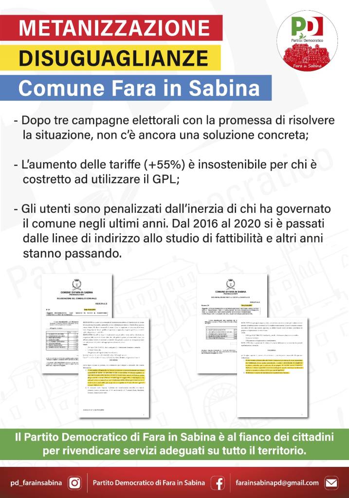 Abbiamo deciso di lanciare una campagna per denunciare tutte le #disuguaglianze presenti sul territorio comunale. Il primo appuntamento riguarda la metanizzazione assente nella parte alta del comune. Ormai da ben tre tornate elettorali viene promessa la risoluzione della situazione che ad oggi sembra ancora lontana. Nel 2016 e nel 2020 in consiglio comunale si è affrontato il tema, prima dando delle linee guida sul tema e poi avviando uno studio di fattibilità. L’aumento delle tariffe, già alte, è una spesa insostenibile per buona parte delle famiglie. Una soluzione che anni fa sembrava adatta oggi risulta non essere più sostenibile e a farne le spese sono i cittadini di Fara in Sabina. Il Partito Democratico è al fianco dei cittadini per rivendicare servici adeguati su tutto il territorio.