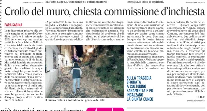 Abbiamo appreso la notizia della consulenza tecnica d’ufficio che renderebbe chiare le cause del crollo – commenta Federica De Santis del direttivo Pd di Fara Sabina -. Qualora venga tutto confermato, la vicenda appare grave ed è ancora più grave che il Comune, pur conoscendo i fatti, abbia emesso due ordinanze nei confronti dei cittadini. Auspichiamo che l’Ente si metta in moto per mettere in sicurezza e ripristinare lo stato dei luoghi quanto prima, visto che è trascorso già troppo tempo con tutti i rischi a questo connessi. E soprattutto, in caso di conferma delle perizie, l’Amministrazione dovrà chiedere scusa ai cittadini costretti a difendersi e quindi a spendere soldi per avviare cause legali, prima, per impugnare al Tar le ordinanze sindacali con le quali il Comune intimava loro di eseguire le opere attribuendo ogni responsabilità civile e penale, poi, per ottenere l’accertamento tecnico presso il Tribunale di Rieti