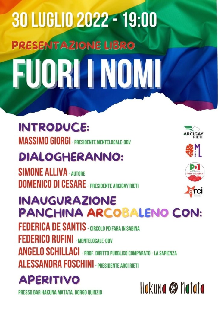 Il 30 luglio alle ore 19:00 all’Hakuna Matata Bar di Borgo Quinzio, insieme a MenteLocale-odv, all’Arci Rieti e l’Arcigay Rieti LGBT, presenteremo il libro “Fuori i nomi” di Simone Alliva.