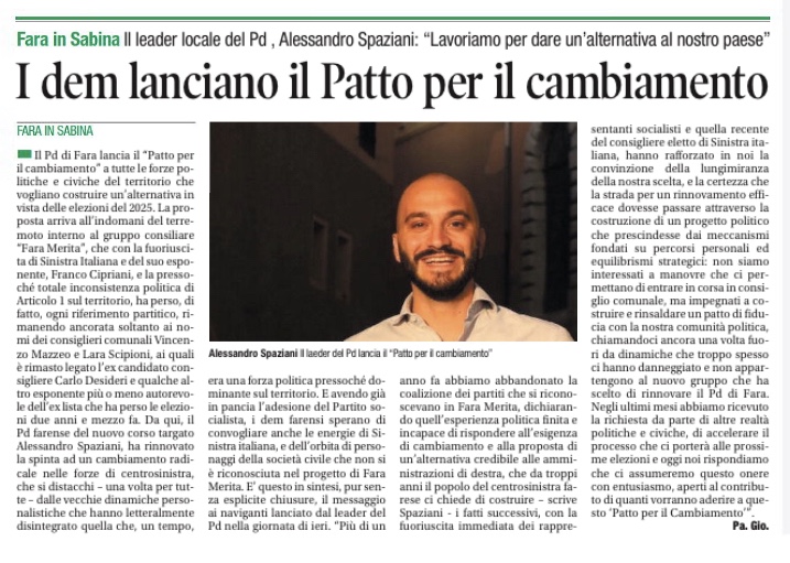 Da quasi due anni il Partito democratico di Fara in Sabina ha rinnovato la sua classe dirigente e intrapreso un nuovo percorso, condiviso con iscritti e militanti, volto a mettere in campo un’attenta opposizione e una costante presenza e proposta sul territorio, accanto ai cittadini.
