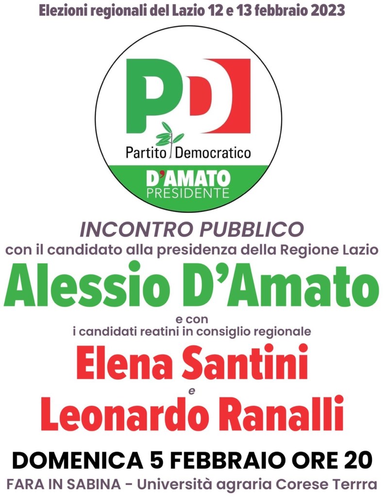 Domenica 5 Febbraio alle ore 20:00 presso l’università agraria di Corese Terra incontreremo il candidato presidente Alessio D’Amato e i candidati Leonardo Ranalli e Elena Santini.