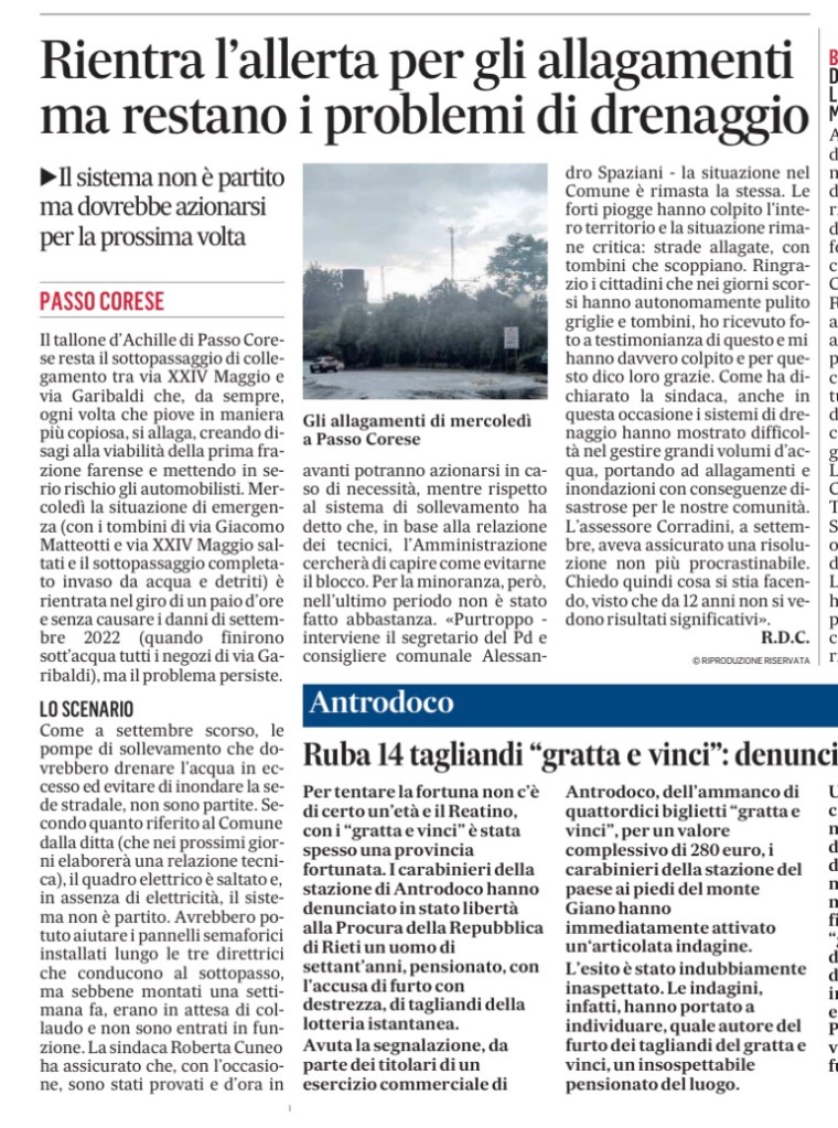 Meno di un anno fa abbiamo vissuto una situazione simile a quella di questi giorni https://m.facebook.com/story.php?story_fbid=10227253667316384&id=1500253674 descritta dall’Assessore Bertini e dalla Sindaca Roberta Cuneo come eventi eccezionali, come si può vedere in questo link https://www.rietilife.com/2022/09/08/maltempo-sabina-nel-caos-danni-e-allagamenti/. In quell’occasione, l’Assessore Corradini ha convocato un sopralluogo urgente, promettendo di non lasciare sole le attività commerciali e di risolvere i problemi (allego foto nei commenti).