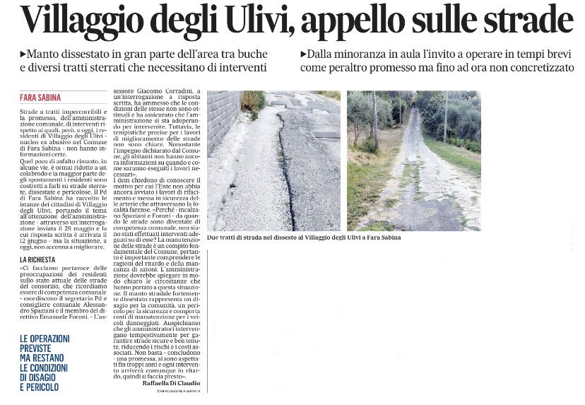 Il manto stradale fortemente dissestato a Villaggio degli Ulivi rappresenta un disagio per la comunità, un pericolo per la sicurezza e comporta costi di manutenzione per i veicoli danneggiati. Auspichiamo che gli amministratori intervengano tempestivamente per garantire strade sicure e ben tenute, riducendo i rischi e i costi associati. Non basta una promessa, si sono aspettati fin troppi anni e ogni intervento arriverà comunque in ritardo, quindi si faccia presto.