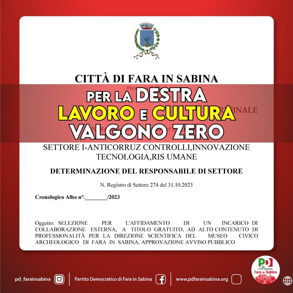 ll Partito Democratico di Fara in Sabina da anni denuncia l’assenza di una visione strategica e l’inadeguatezza nella gestione delle politiche culturali da parte della destra al governo della città, evidenziata dalla recente scelta di emettere un bando per la direzione del Museo Civico Archeologico senza prevedere alcun compenso per il direttore, cui però si chiede un’elevata qualifica. Una scelta che ha esposto Fara in Sabina e il valore che qui si dà alla cultura a critiche provenienti ben oltre i confini del nostro territorio, con un danno di immagine e di credibilità di cui la Giunta Cuneo dovrebbe assumersi la responsabilità, invece di rispondere stizzita e mai nel merito ai rilievi sollevati dall’opposizione e dall’opinione pubblica.