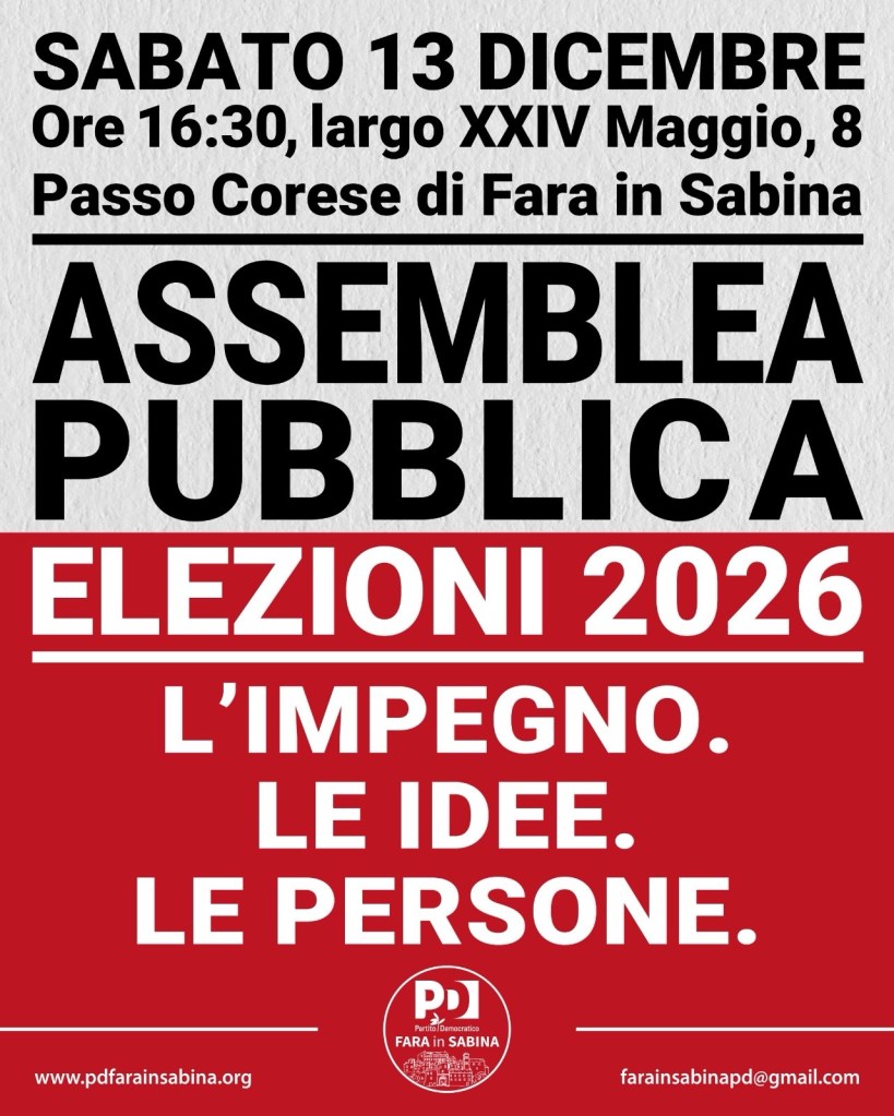 Il Partito Democratico di Fara in Sabina invita iscritti, simpatizzanti e cittadini all’Assemblea Pubblica dal titolo “Elezioni 2026 – L’impegno. Le idee. Le persone.”